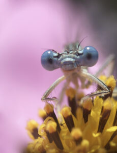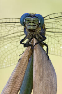 front of wild yellow black dragonfly anax imperator on a wood leaf in the bush
