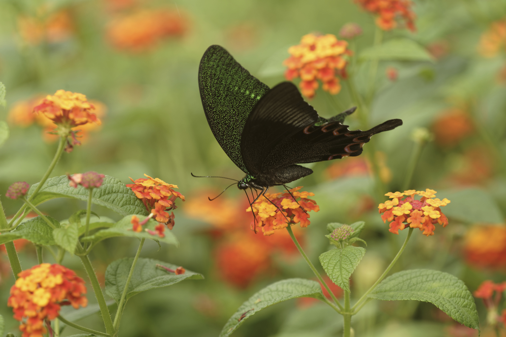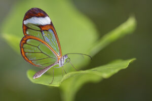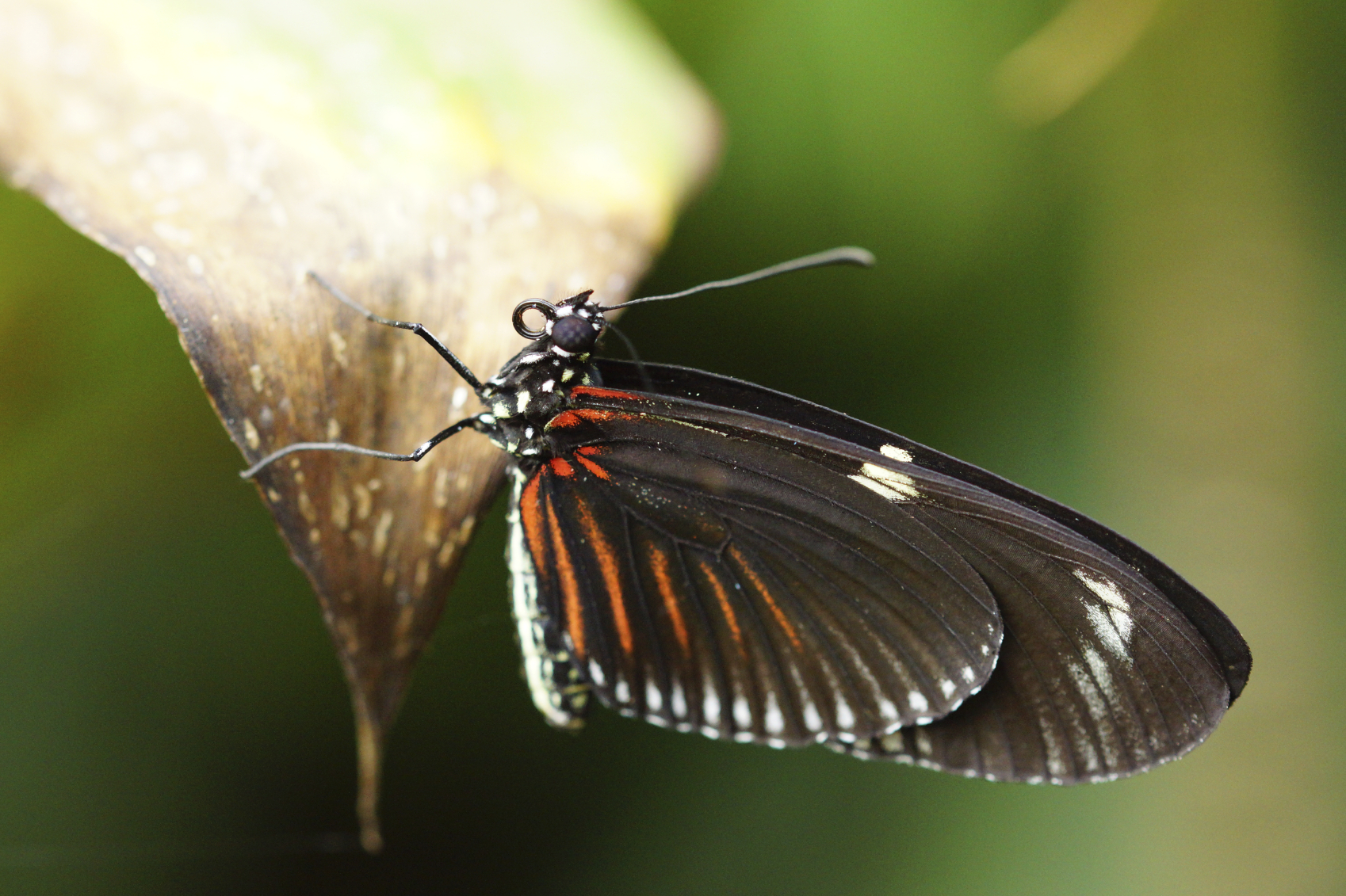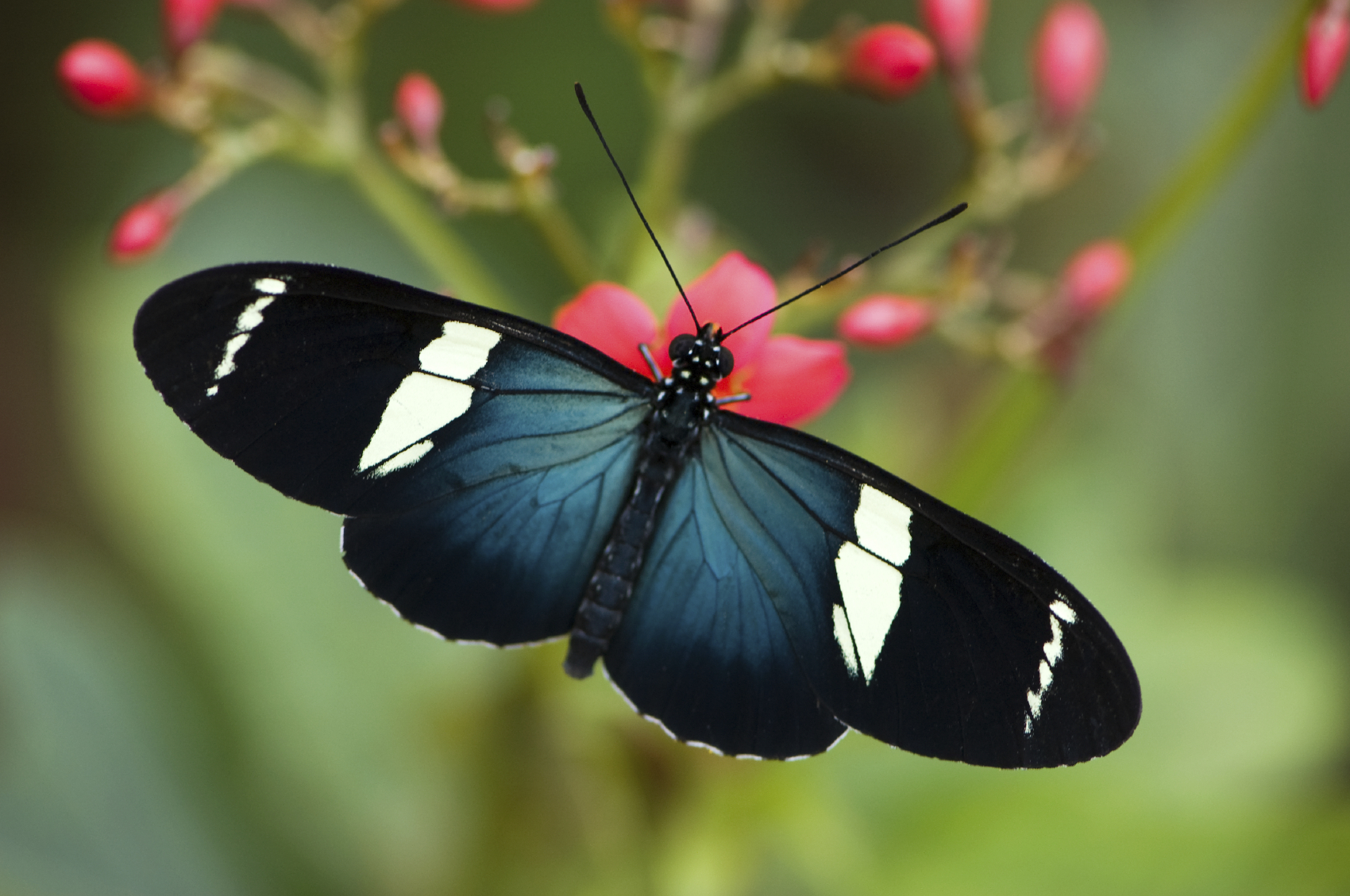 Top view of Sara Longwing butterfly (Heliconius sara) sitting on a red flower with a blurred green background.