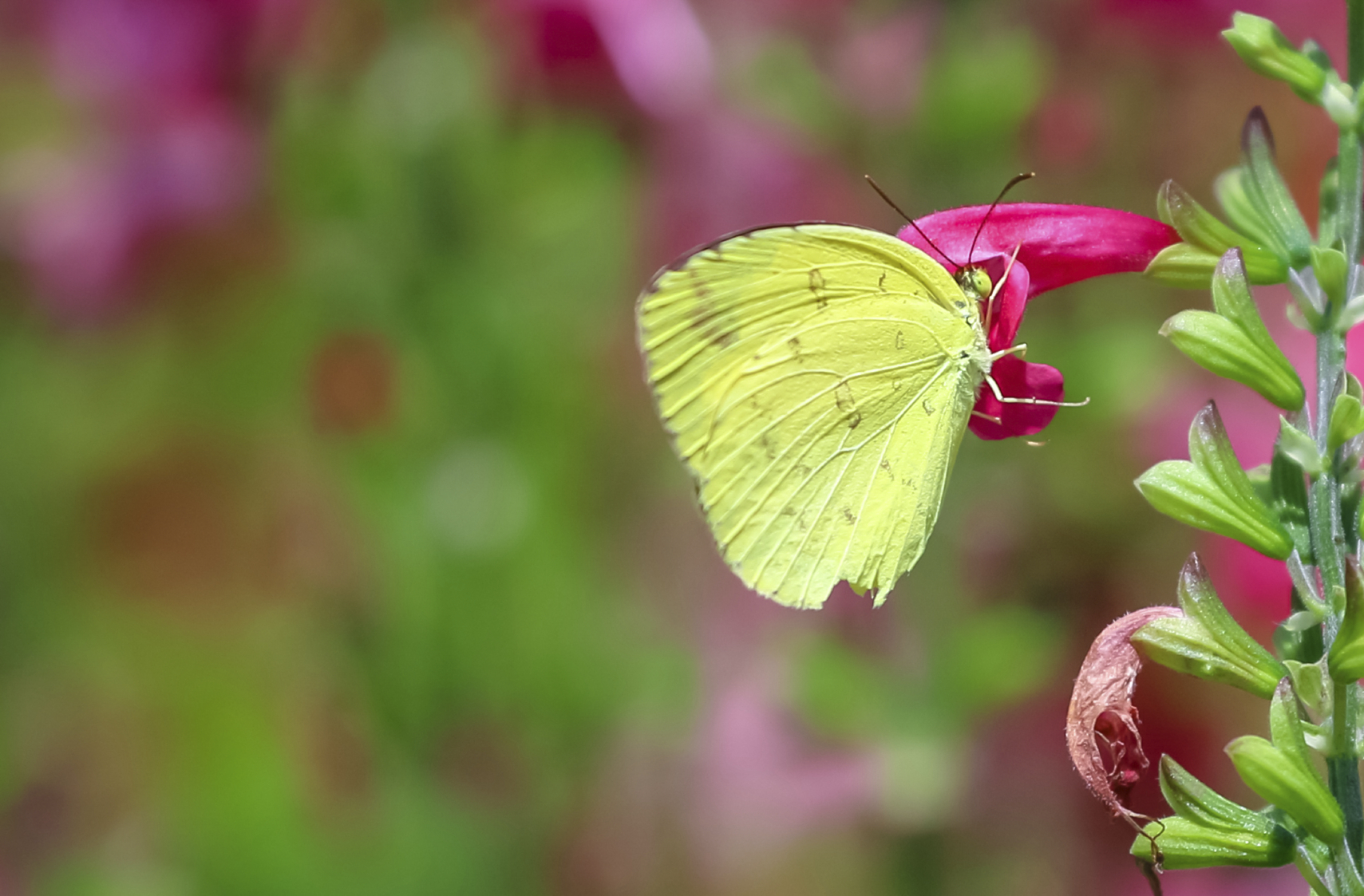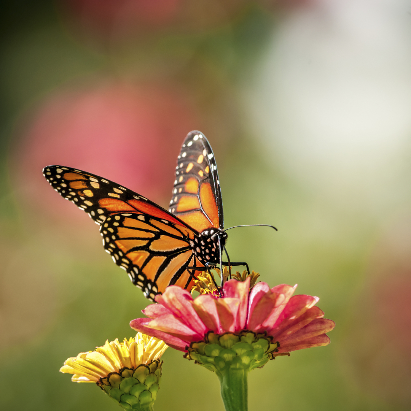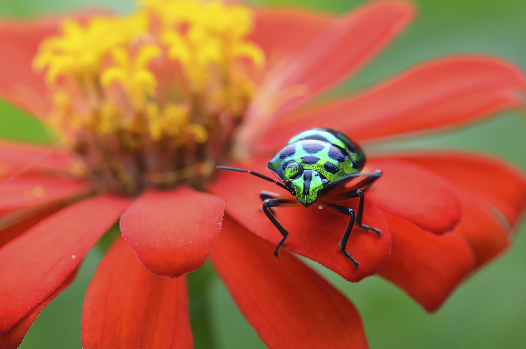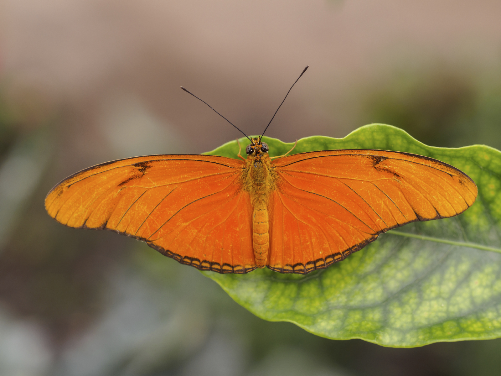 Top view of Sara Longwing butterfly (Heliconius sara) sitting on a red flower with a blurred green background.