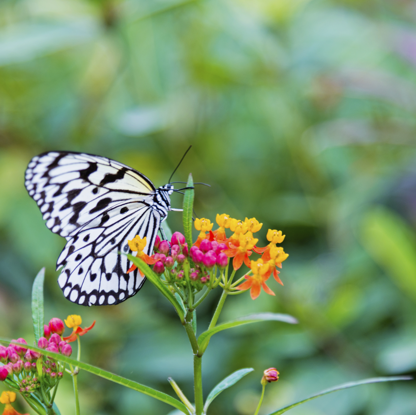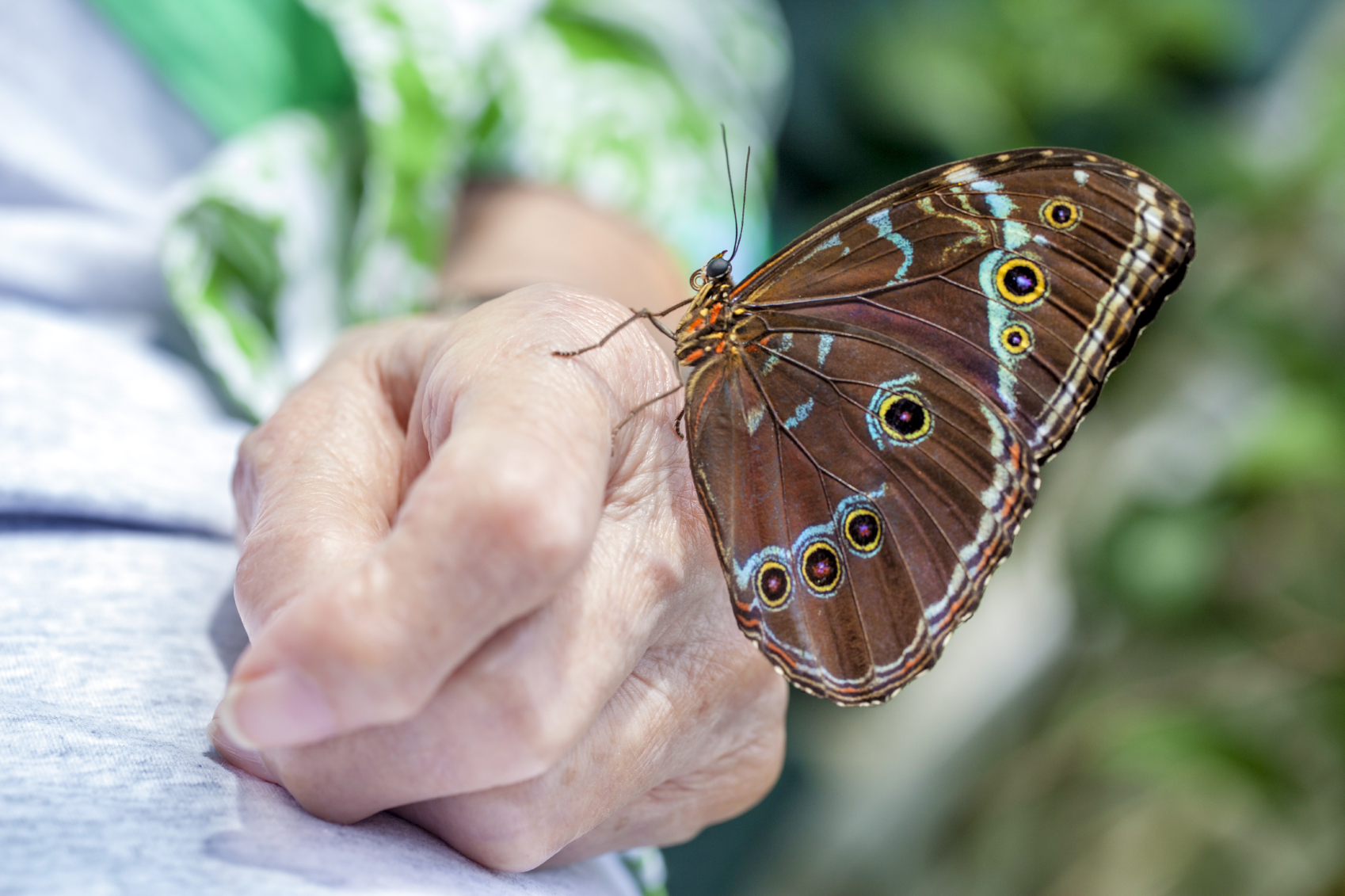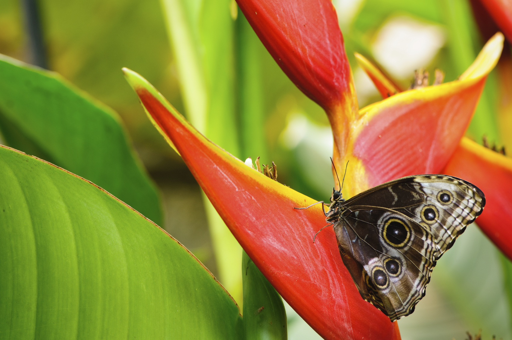Blue morpho butterfly (Morpho peleides) on a tropical plant flower. Image taken in Costa Rica