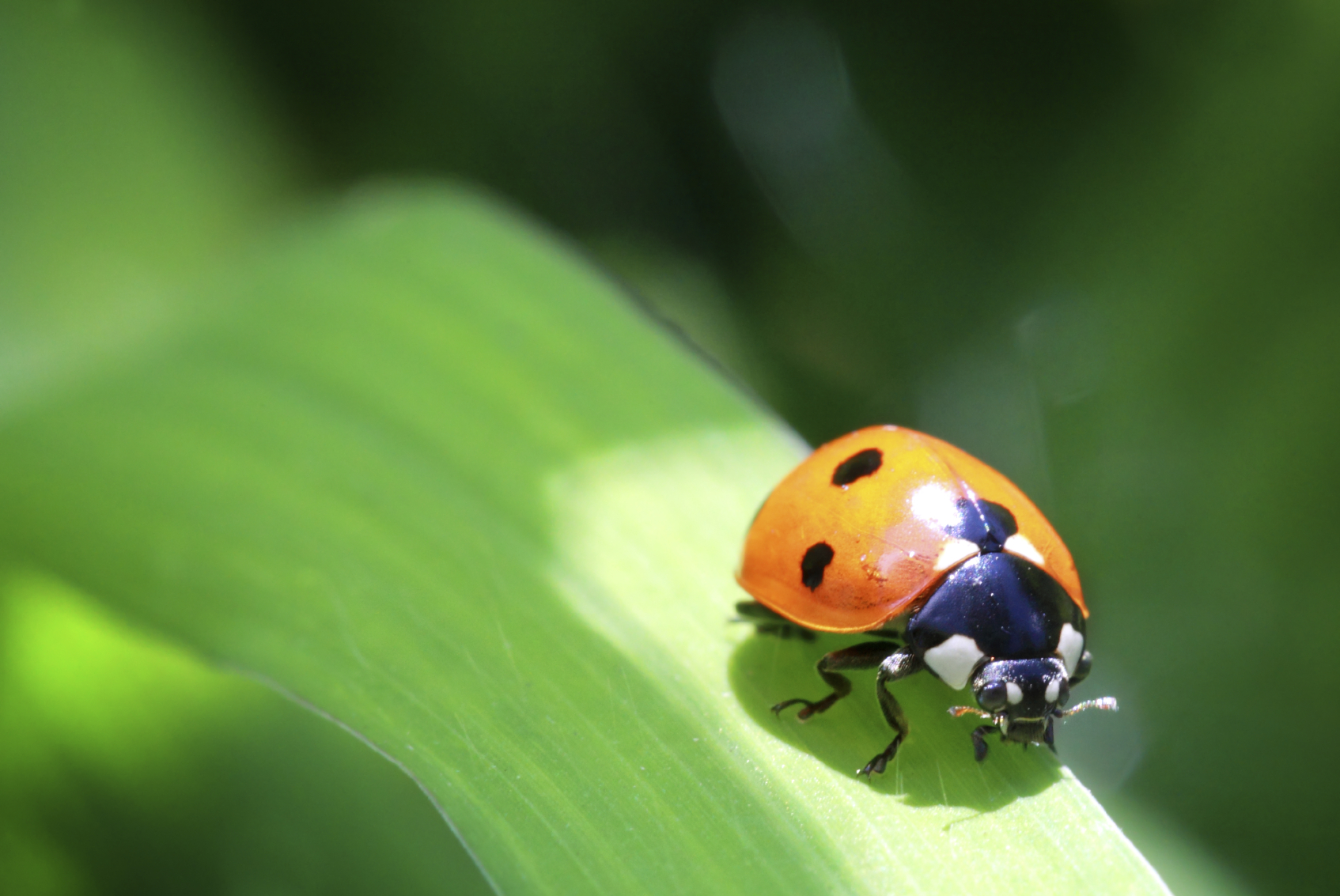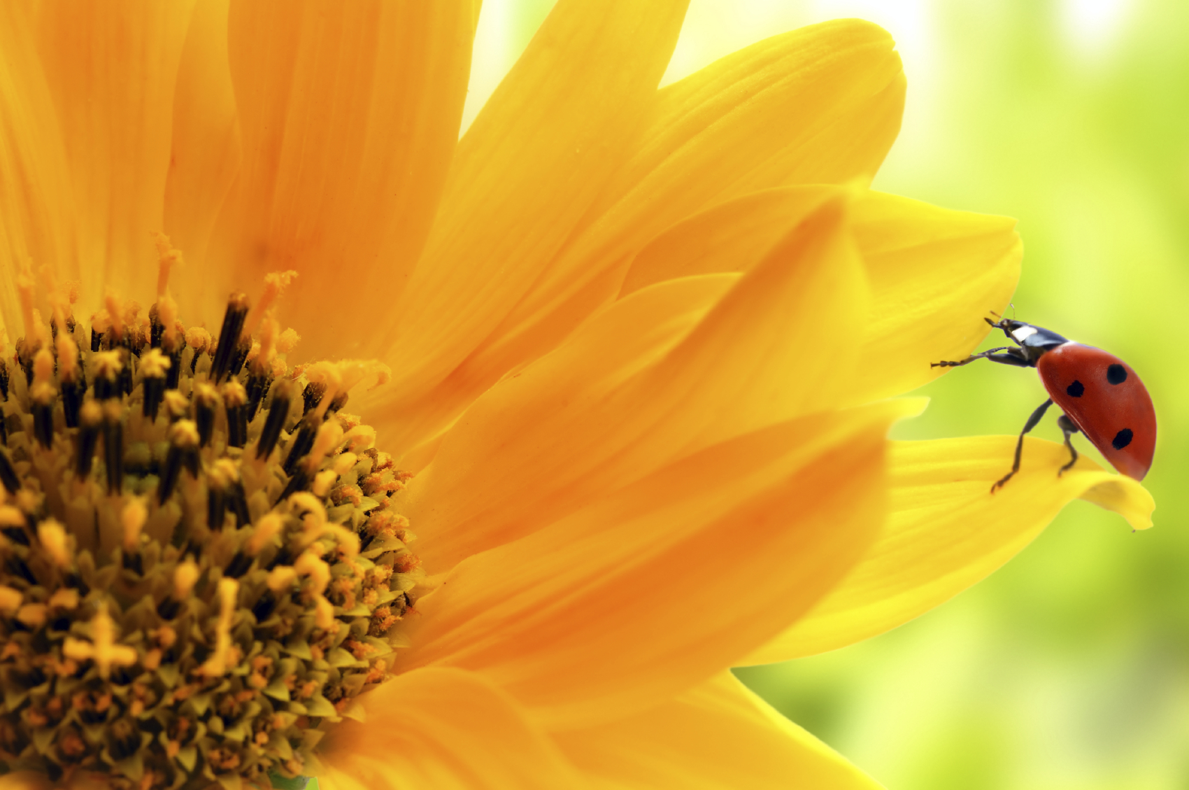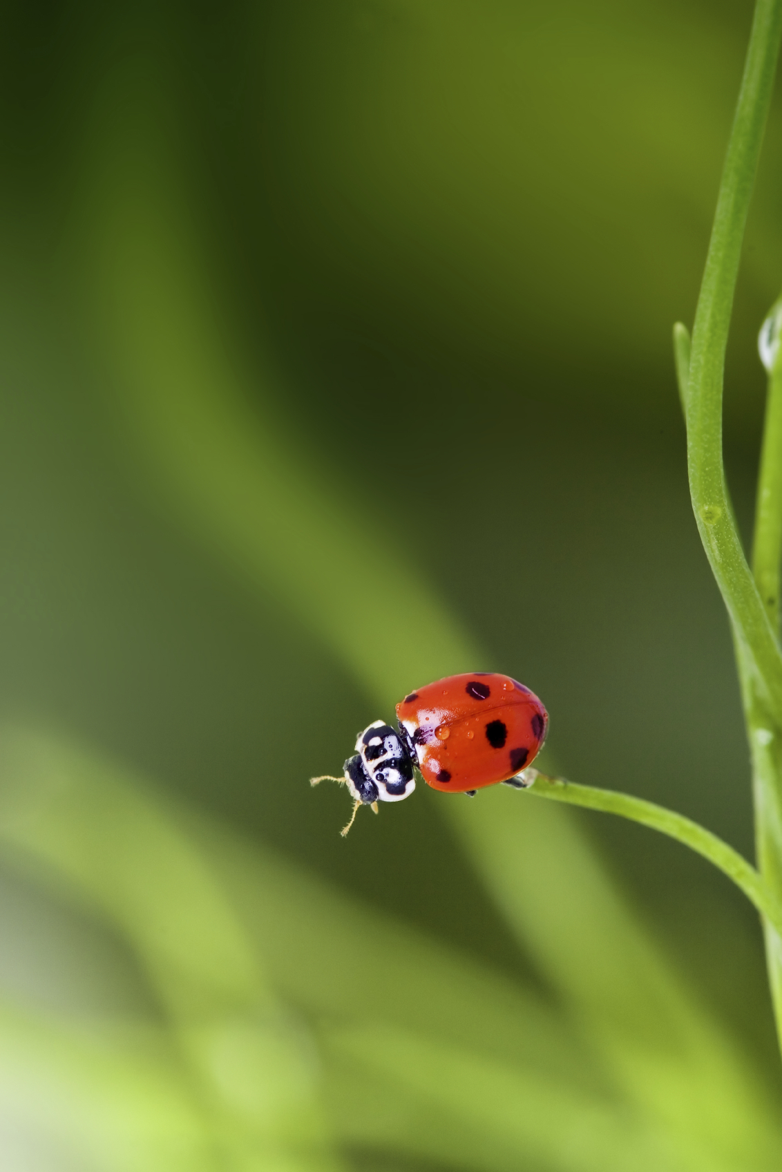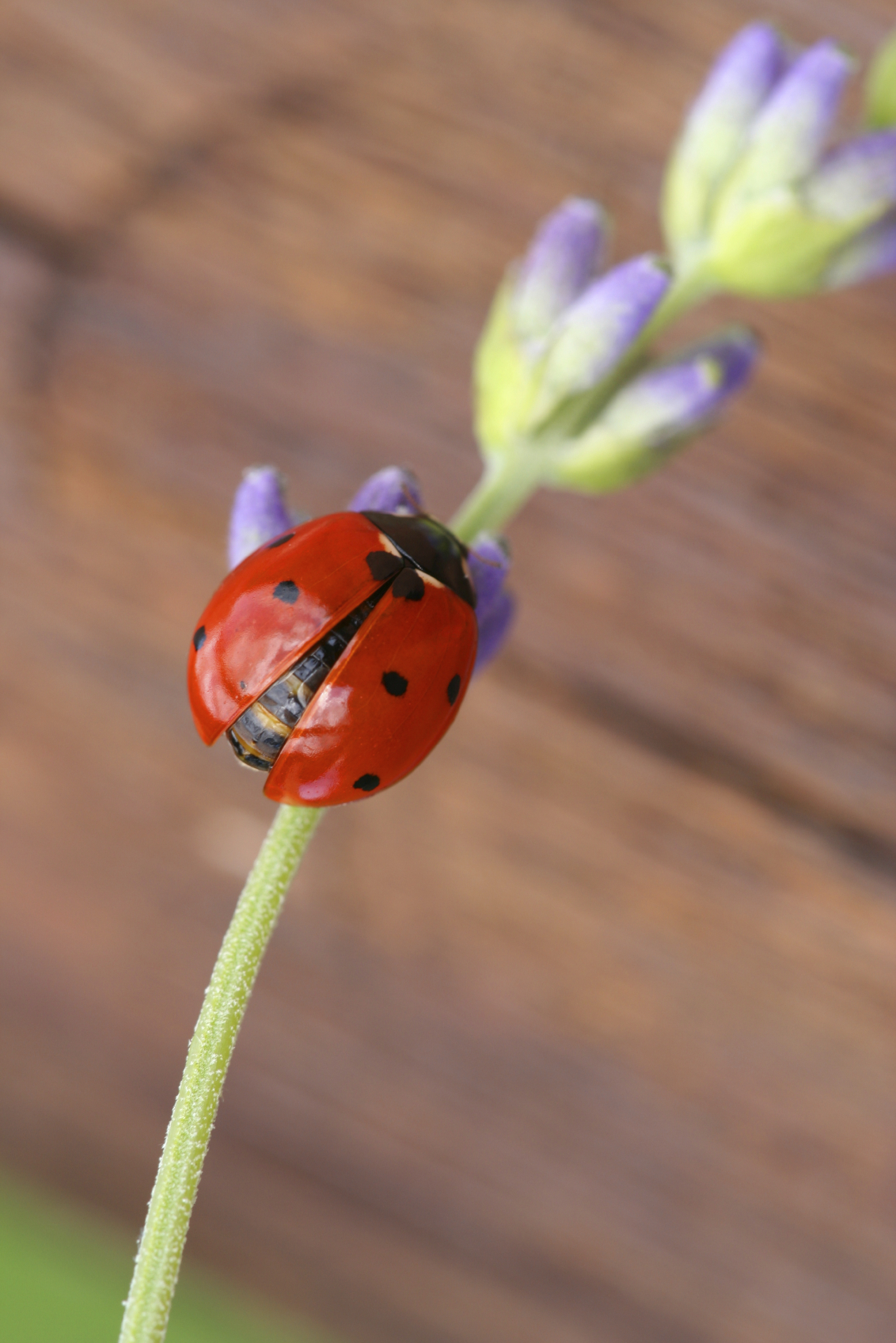 Ladybug ready to fly away, beginning to spread his wings, on violet flower, with brown background.