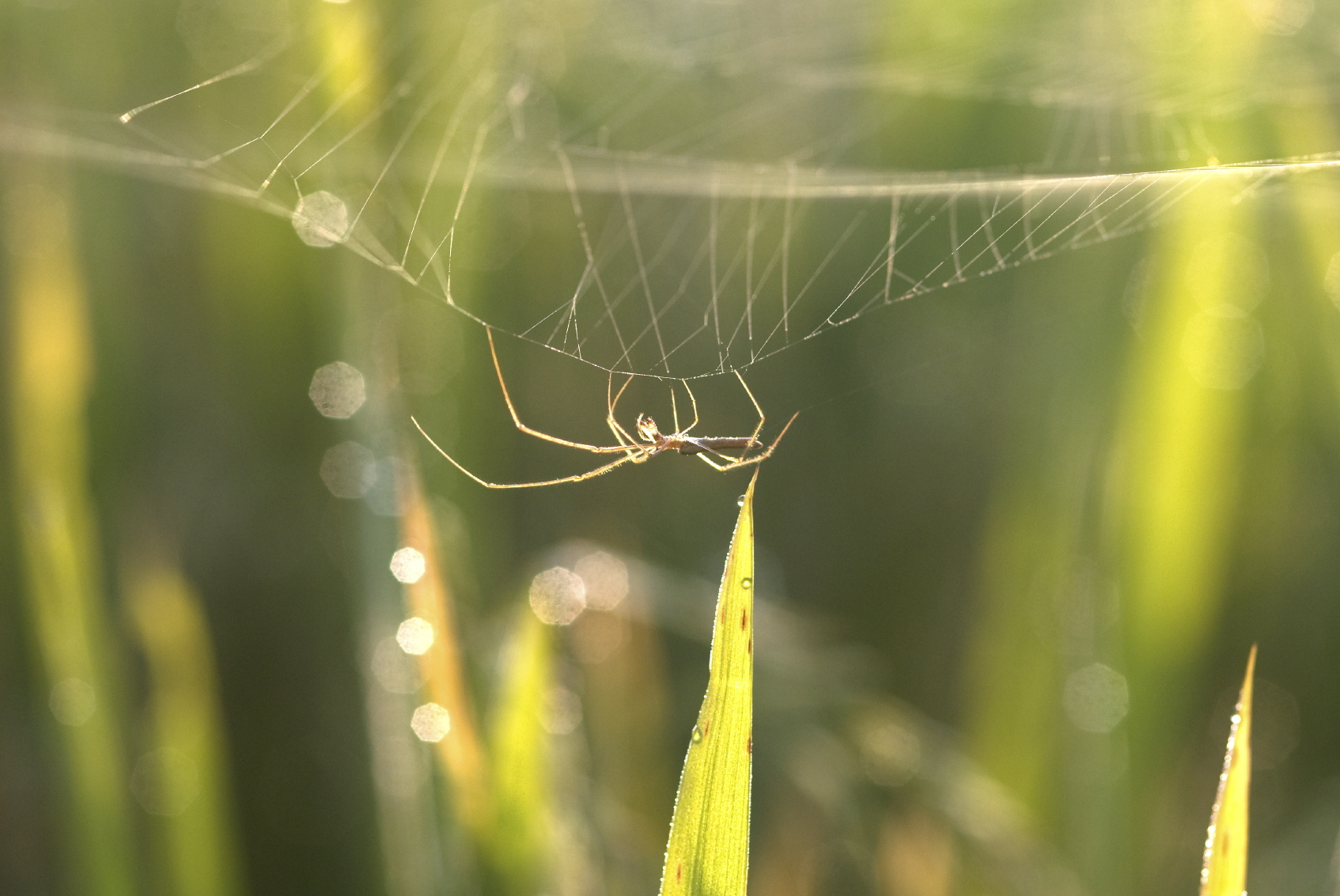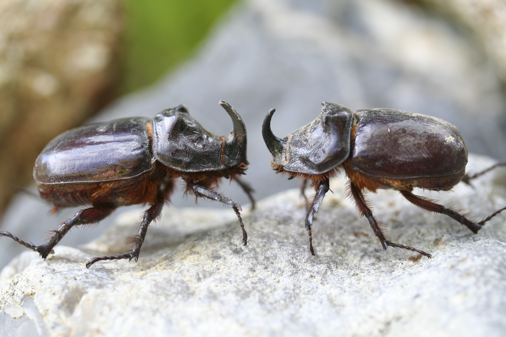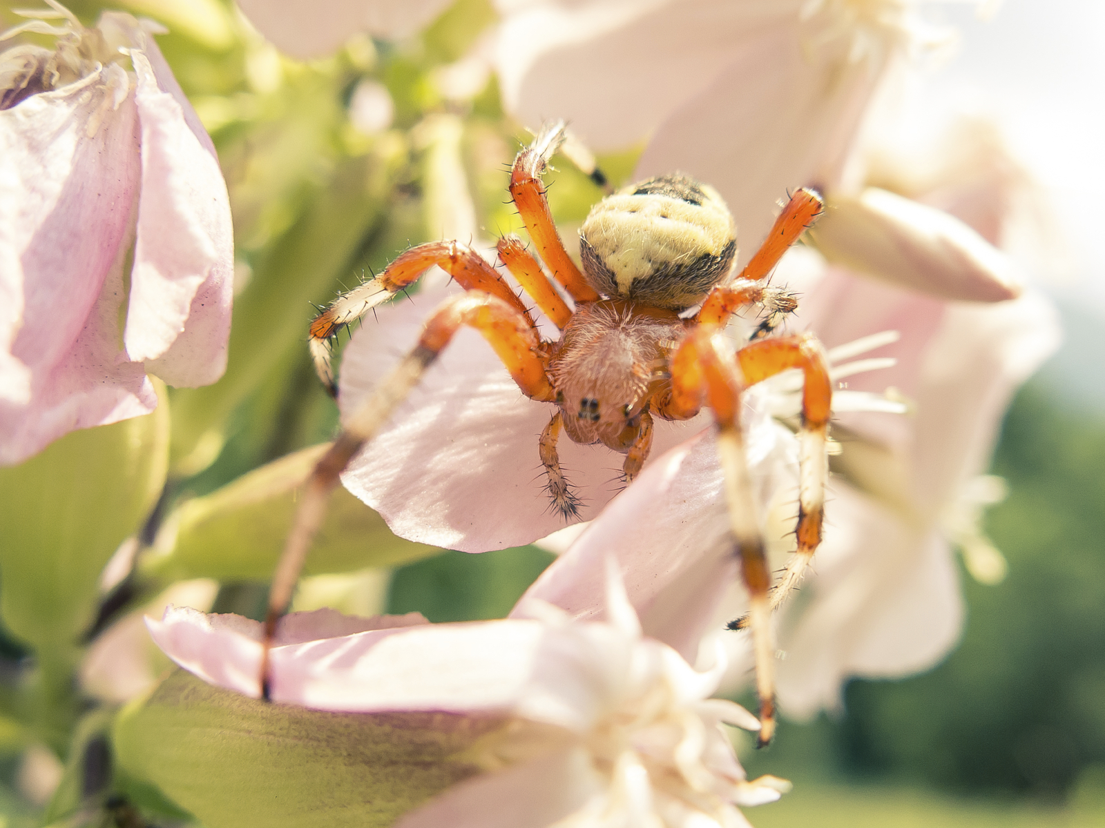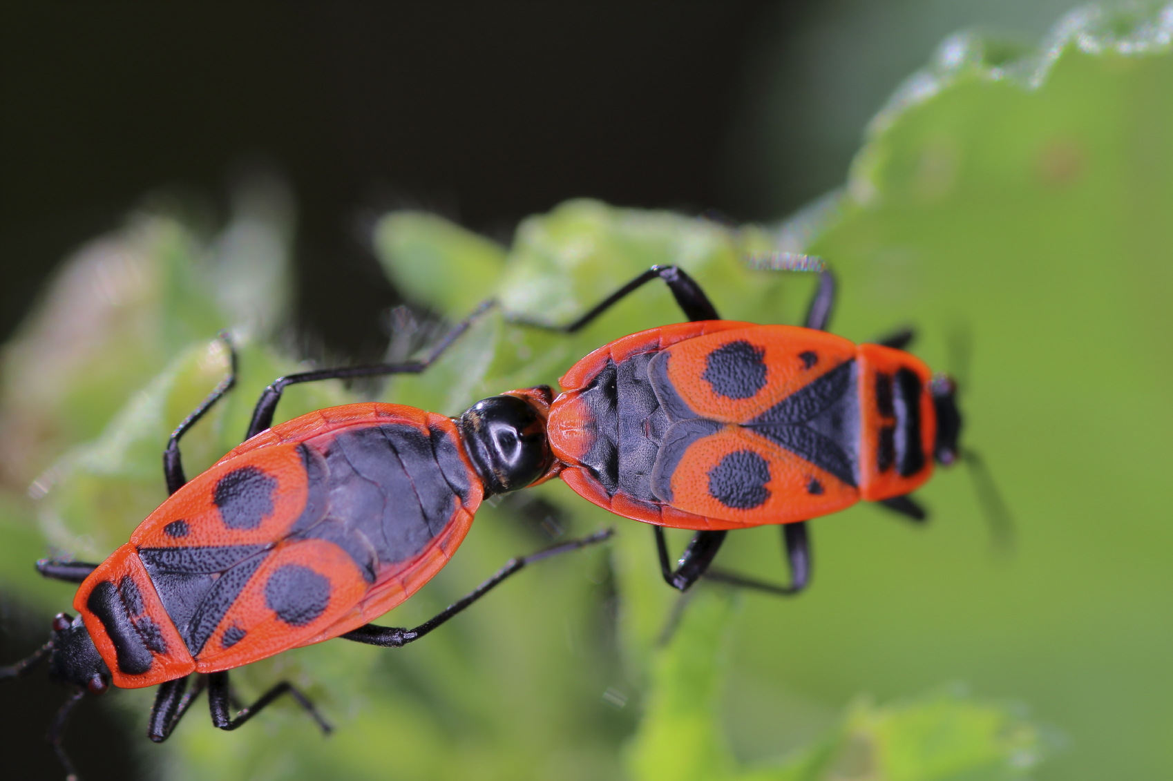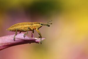 Ladybug ready to fly away, beginning to spread his wings, on violet flower, with brown background.
