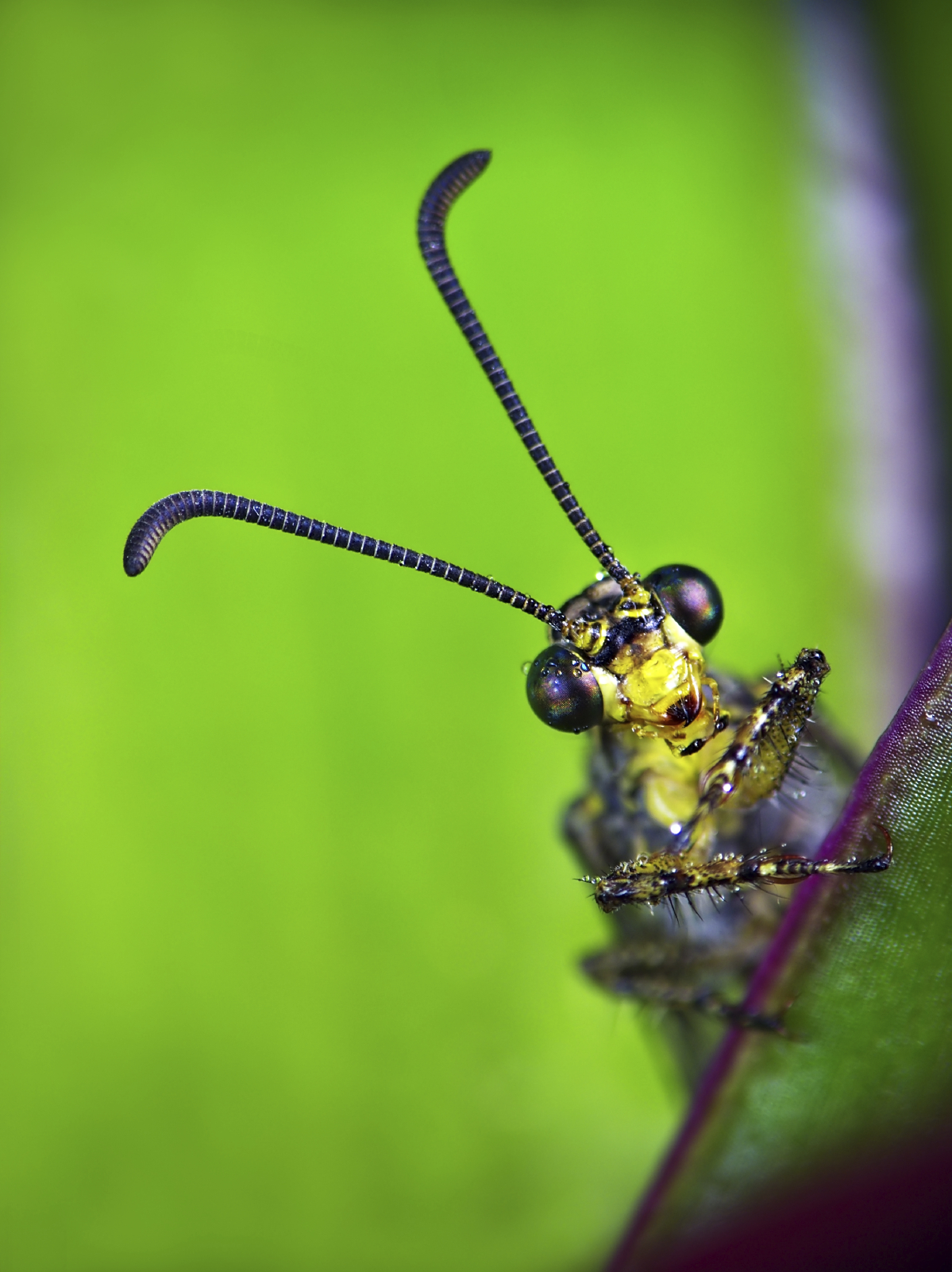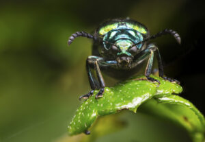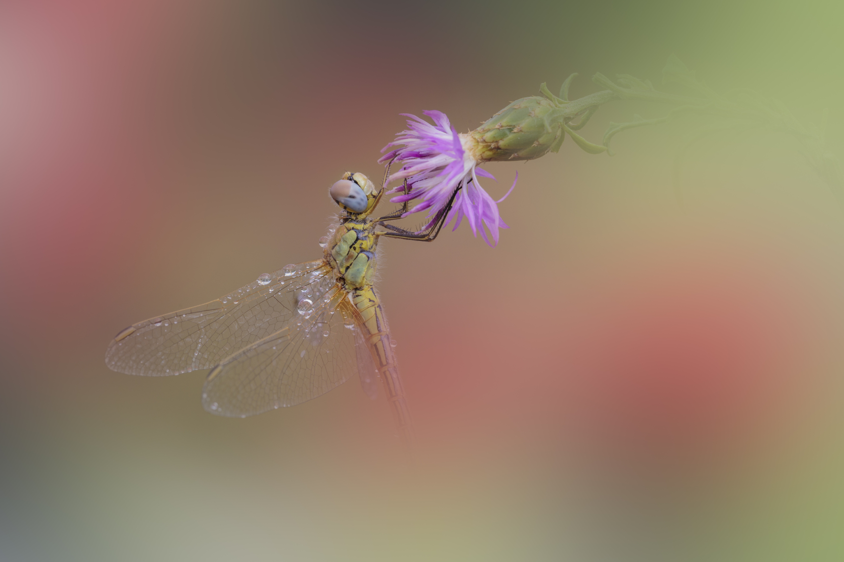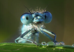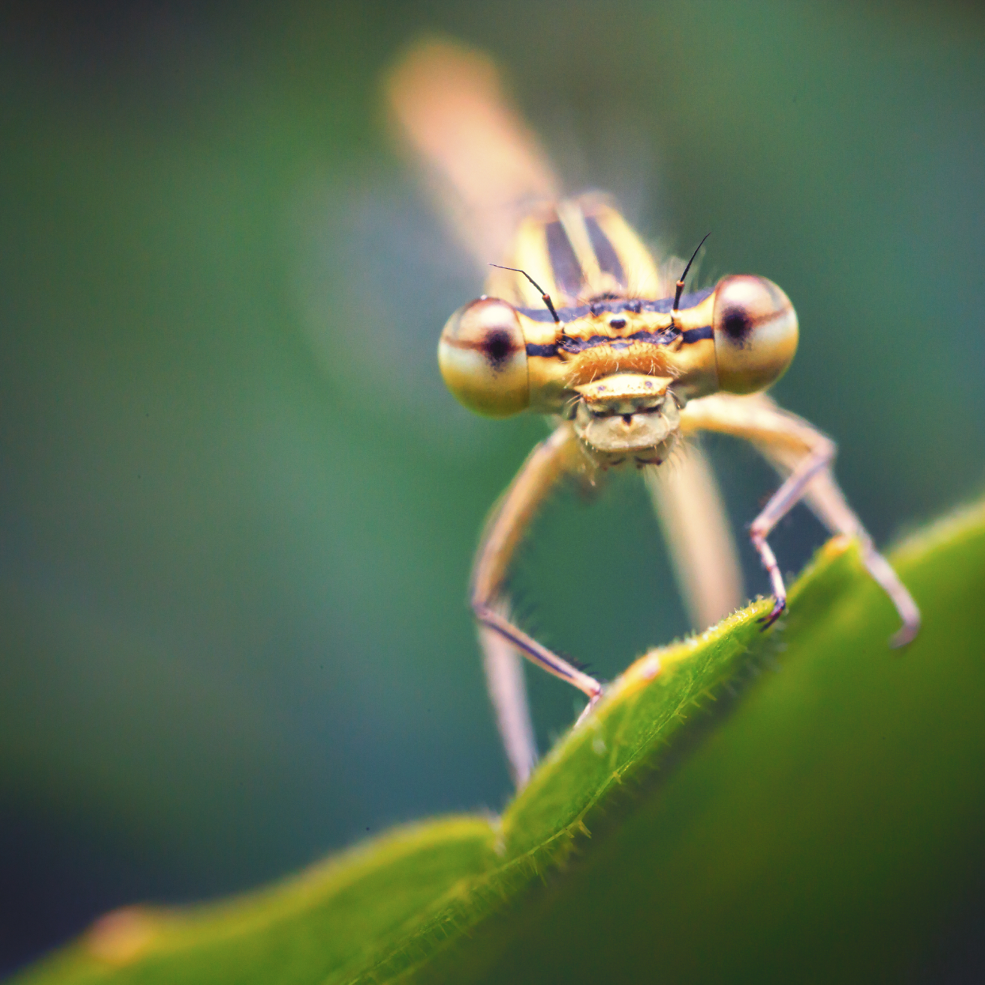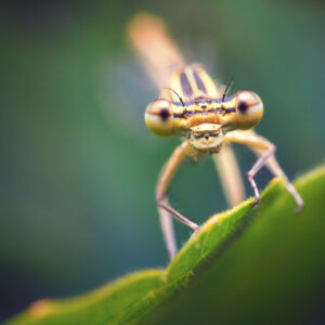 front of wild yellow black dragonfly anax imperator on a wood leaf in the bush